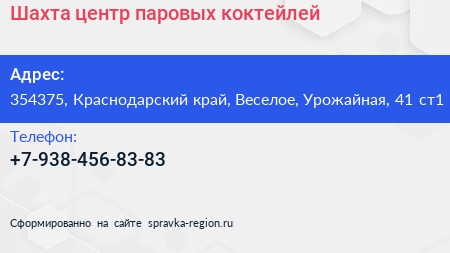 Шахта, центр паровых коктейлей по адресу 354375, Краснодарский край, Веселое, Урожайная, 41 ст1 в дальнейшем Организация, размещена в следующих категориях: