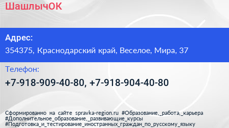 ШашлычОК по адресу 354375, Краснодарский край, Веселое, Мира, 37 в дальнейшем Организация, размещена в следующих категориях:
