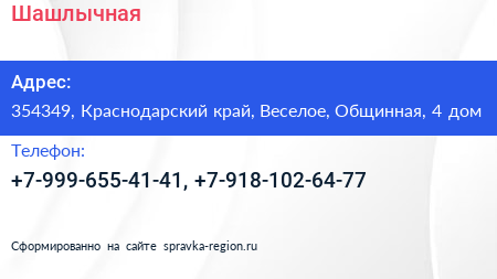 Шашлычная по адресу 354349, Краснодарский край, Веселое, Общинная, 4 дом в дальнейшем Организация, размещена в следующих категориях: