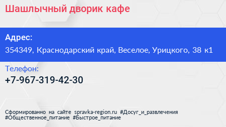 Шашлычный дворик, кафе по адресу 354349, Краснодарский край, Веселое, Урицкого, 38 к1 в дальнейшем Организация, размещена в следующих категориях: