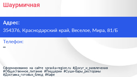 Шаурмичная по адресу 354376, Краснодарский край, Веселое, Мира, 81/Б в дальнейшем Организация, размещена в следующих категориях: