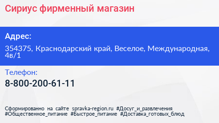 Сириус, фирменный магазин по адресу 354375, Краснодарский край, Веселое, Международная, 4в/1 в дальнейшем Организация, размещена в следующих категориях: