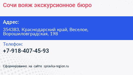 Сочи-вояж, экскурсионное бюро по адресу 354383, Краснодарский край, Веселое, Ворошиловградская, 198 в дальнейшем Организация, размещена в следующих категориях: