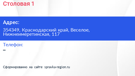 Столовая №1 по адресу 354349, Краснодарский край, Веселое, Нижнеимеретинская, 117 в дальнейшем Организация, размещена в следующих категориях: