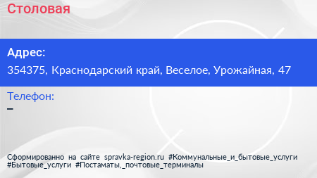 Столовая по адресу 354375, Краснодарский край, Веселое, Урожайная, 47 в дальнейшем Организация, размещена в следующих категориях:
