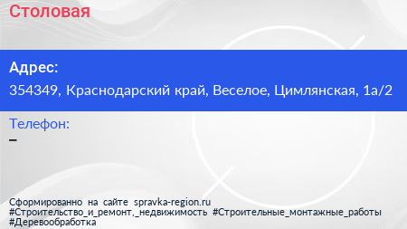 Столовая по адресу 354349, Краснодарский край, Веселое, Цимлянская, 1а/2 в дальнейшем Организация, размещена в следующих категориях: