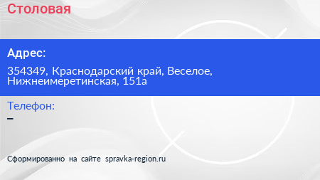 Столовая по адресу 354349, Краснодарский край, Веселое, Нижнеимеретинская, 151а в дальнейшем Организация, размещена в следующих категориях: