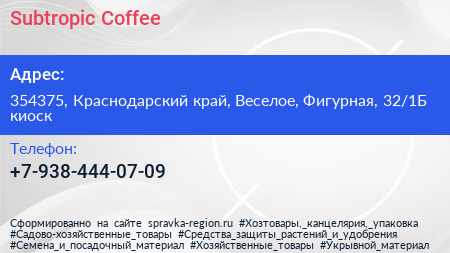 Subtropic Coffee по адресу 354375, Краснодарский край, Веселое, Фигурная, 32/1Б киоск в дальнейшем Организация, размещена в следующих категориях: