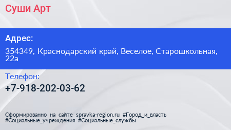Суши Арт по адресу 354349, Краснодарский край, Веселое, Старошкольная, 22а в дальнейшем Организация, размещена в следующих категориях: