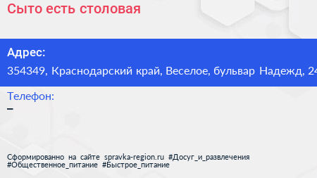 Сыто есть, столовая по адресу 354349, Краснодарский край, Веселое, бульвар Надежд, 24 в дальнейшем Организация, размещена в следующих категориях: