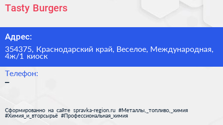 Tasty Burgers по адресу 354375, Краснодарский край, Веселое, Международная, 4ж/1 киоск в дальнейшем Организация, размещена в следующих категориях: