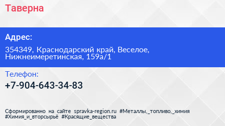 Таверна по адресу 354349, Краснодарский край, Веселое, Нижнеимеретинская, 159а/1 в дальнейшем Организация, размещена в следующих категориях:
