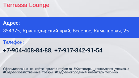 Terrassa Lounge по адресу 354375, Краснодарский край, Веселое, Камышовая, 25 в дальнейшем Организация, размещена в следующих категориях: