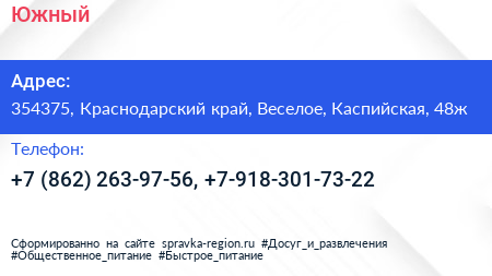 Южный по адресу 354375, Краснодарский край, Веселое, Каспийская, 48ж в дальнейшем Организация, размещена в следующих категориях:
