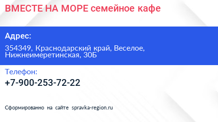 #ВМЕСТЕ НА МОРЕ, семейное кафе по адресу 354349, Краснодарский край, Веселое, Нижнеимеретинская, 30Б в дальнейшем Организация, размещена в следующих категориях: