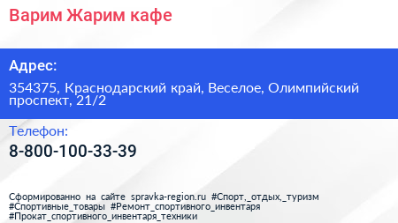 Варим! Жарим!, кафе по адресу 354375, Краснодарский край, Веселое, Олимпийский проспект, 21/2 в дальнейшем Организация, размещена в следующих категориях: