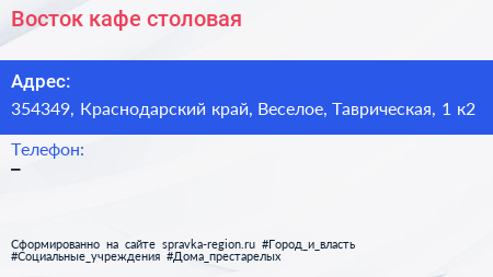 Восток, кафе-столовая по адресу 354349, Краснодарский край, Веселое, Таврическая, 1 к2 в дальнейшем Организация, размещена в следующих категориях: