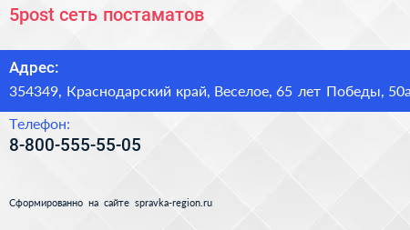 5post, сеть постаматов по адресу 354349, Краснодарский край, Веселое, 65 лет Победы, 50а в дальнейшем Организация, размещена в следующих категориях: