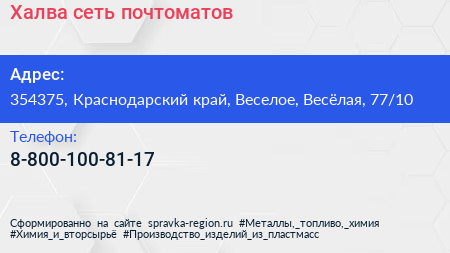 Халва, сеть почтоматов по адресу 354375, Краснодарский край, Веселое, Весёлая, 77/10 в дальнейшем Организация, размещена в следующих категориях: