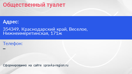 Общественный туалет по адресу 354349, Краснодарский край, Веселое, Нижнеимеретинская, 171ж в дальнейшем Организация, размещена в следующих категориях: