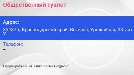 Общественный туалет по адресу 354375, Краснодарский край, Веселое, Урожайная, 33 лит У в дальнейшем Организация, размещена в следующих категориях: