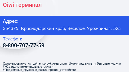 Qiwi, терминал по адресу 354375, Краснодарский край, Веселое, Урожайная, 52а в дальнейшем Организация, размещена в следующих категориях: