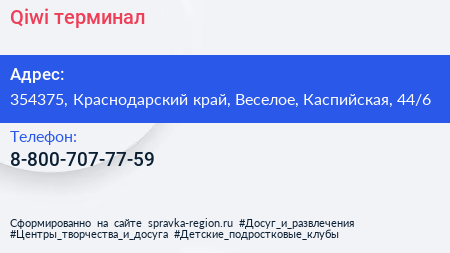 Qiwi, терминал по адресу 354375, Краснодарский край, Веселое, Каспийская, 44/6 в дальнейшем Организация, размещена в следующих категориях: