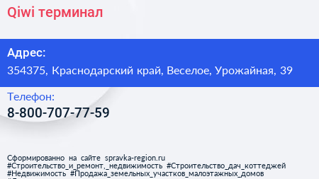 Qiwi, терминал по адресу 354375, Краснодарский край, Веселое, Урожайная, 39 в дальнейшем Организация, размещена в следующих категориях: