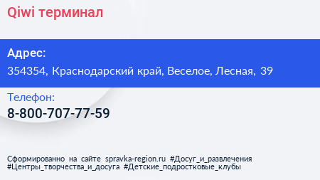 Qiwi, терминал по адресу 354354, Краснодарский край, Веселое, Лесная, 39 в дальнейшем Организация, размещена в следующих категориях: