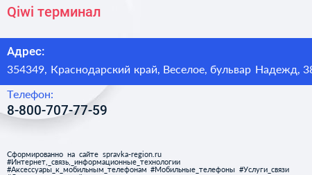 Qiwi, терминал по адресу 354349, Краснодарский край, Веселое, бульвар Надежд, 38 в дальнейшем Организация, размещена в следующих категориях: