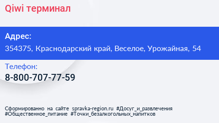 Qiwi, терминал по адресу 354375, Краснодарский край, Веселое, Урожайная, 54 в дальнейшем Организация, размещена в следующих категориях: