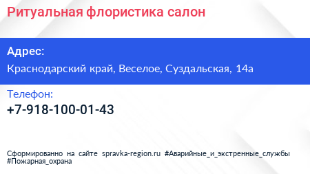 Ритуальная флористика, салон по адресу Краснодарский край, Веселое, Суздальская, 14а в дальнейшем Организация, размещена в следующих категориях: