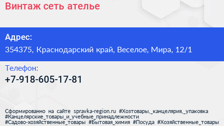 Винтаж, сеть ателье по адресу 354375, Краснодарский край, Веселое, Мира, 12/1 в дальнейшем Организация, размещена в следующих категориях: