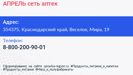 АПРЕЛЬ, сеть аптек по адресу 354375, Краснодарский край, Веселое, Мира, 19 в дальнейшем Организация, размещена в следующих категориях: