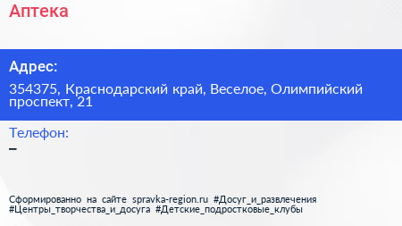 Аптека по адресу 354375, Краснодарский край, Веселое, Олимпийский проспект, 21 в дальнейшем Организация, размещена в следующих категориях: