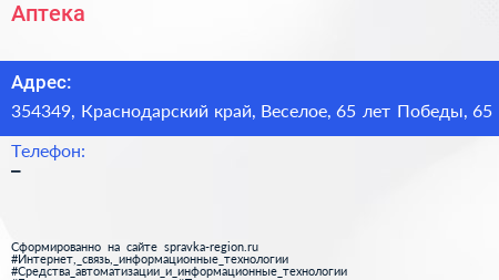 Аптека по адресу 354349, Краснодарский край, Веселое, 65 лет Победы, 65 в дальнейшем Организация, размещена в следующих категориях: