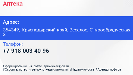 Аптека по адресу 354349, Краснодарский край, Веселое, Старообрядческая, 2 в дальнейшем Организация, размещена в следующих категориях: