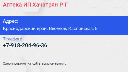 Аптека, ИП Хачатрян Р.Г. по адресу Краснодарский край, Веселое, Каспийская, 8 в дальнейшем Организация, размещена в следующих категориях: