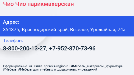 Чио Чио, парикмахерская по адресу 354375, Краснодарский край, Веселое, Урожайная, 74а в дальнейшем Организация, размещена в следующих категориях: