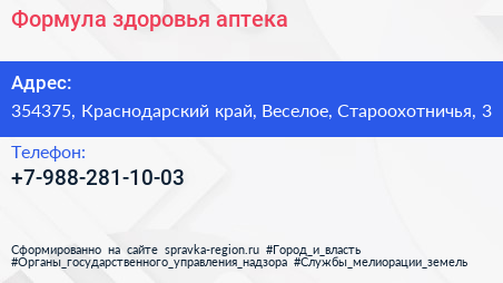 Формула здоровья, аптека по адресу 354375, Краснодарский край, Веселое, Староохотничья, 3 в дальнейшем Организация, размещена в следующих категориях:
