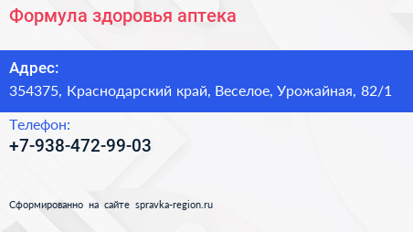 Формула здоровья, аптека по адресу 354375, Краснодарский край, Веселое, Урожайная, 82/1 в дальнейшем Организация, размещена в следующих категориях: