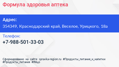 Формула здоровья, аптека по адресу 354349, Краснодарский край, Веселое, Урицкого, 18а в дальнейшем Организация, размещена в следующих категориях: