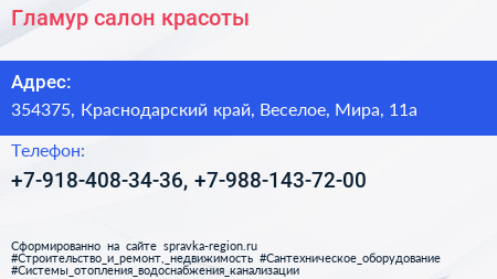 Гламур, салон красоты по адресу 354375, Краснодарский край, Веселое, Мира, 11а в дальнейшем Организация, размещена в следующих категориях: