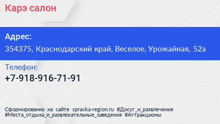 Карэ, салон по адресу 354375, Краснодарский край, Веселое, Урожайная, 52а в дальнейшем Организация, размещена в следующих категориях: