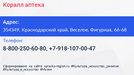 Коралл, аптека по адресу 354349, Краснодарский край, Веселое, Фигурная, 66-68 в дальнейшем Организация, размещена в следующих категориях: