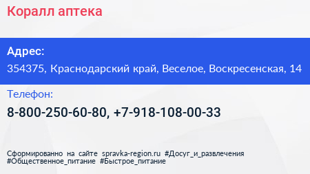 Коралл, аптека по адресу 354375, Краснодарский край, Веселое, Воскресенская, 14 в дальнейшем Организация, размещена в следующих категориях:
