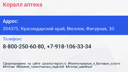 Коралл, аптека по адресу 354375, Краснодарский край, Веселое, Фигурная, 10 в дальнейшем Организация, размещена в следующих категориях: