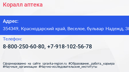 Коралл, аптека по адресу 354349, Краснодарский край, Веселое, бульвар Надежд, 38 в дальнейшем Организация, размещена в следующих категориях: