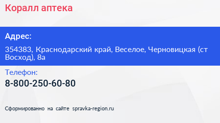 Коралл, аптека по адресу 354383, Краснодарский край, Веселое, Черновицкая (ст Восход), 8а в дальнейшем Организация, размещена в следующих категориях:
