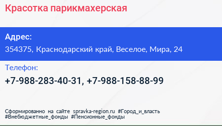 Красотка, парикмахерская по адресу 354375, Краснодарский край, Веселое, Мира, 24 в дальнейшем Организация, размещена в следующих категориях: